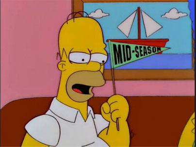 It’s funny how ideas will pop into your head, leading you to go a certain way. When I was reading my notes for this day I was wondering what direction I was going to go with this comic. Just before I drew the thumbnail for this, Bam! The visual gag The Simpsons have used, with Homer holding a pennant for various things, came to mind and using this was a no-brainer for me. Here’s just two of those visual gags: