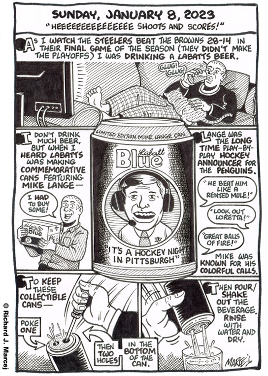 I’ve got a pretty decent can collection. They’re all sports related and with the exception of a Coke can, they’re all beer cans. I have these displayed on top of the mantle of my downstairs fireplace.