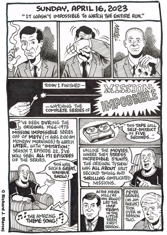 Some of these retro shows that I’ve been recording to watch later I’ll mainly listen to, while drawing. But “Mission Impossible” is the kind of show that you have to pay attention to. There’s too many scenes that are intricate[…]↓ Read the rest of this entry…